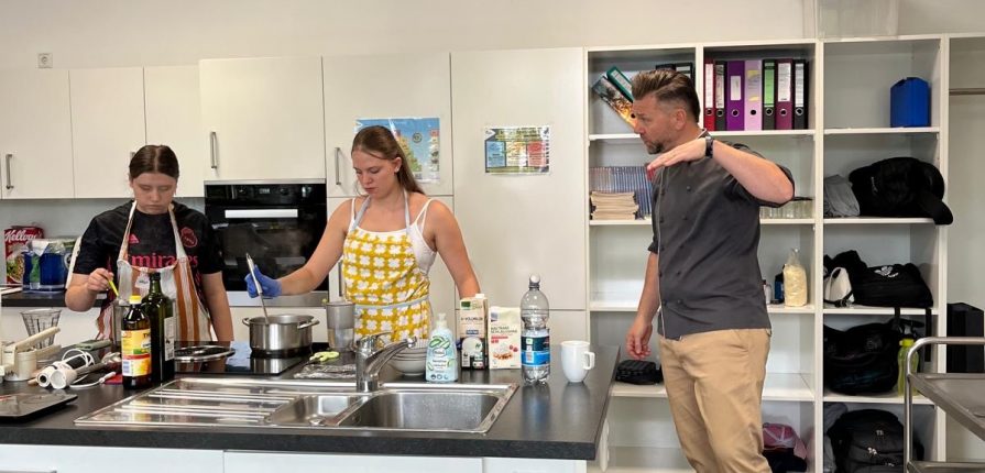 Die AES-Gruppen R9b & R9d durften einen ganzen Vormittag mit Sternekoch André Tienelt (Hotel Ritter, Durbach) in der Küche stehen! Gemeinsam wurden u.a. selbstgemachte Gnocchi und Crème Brûlée mit marinierten Beeren & Erdbeeren zubereitet – wie echte Profis! Ein mega Erlebnis – danke an Herrn Tienelt für die Tipps, Tricks & die Motivation!