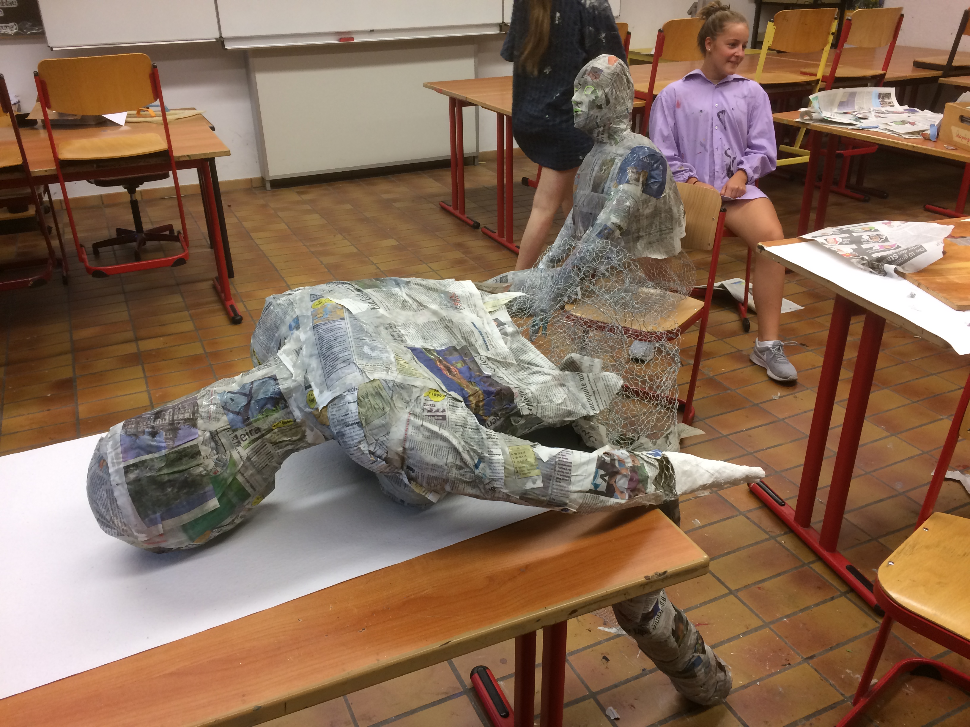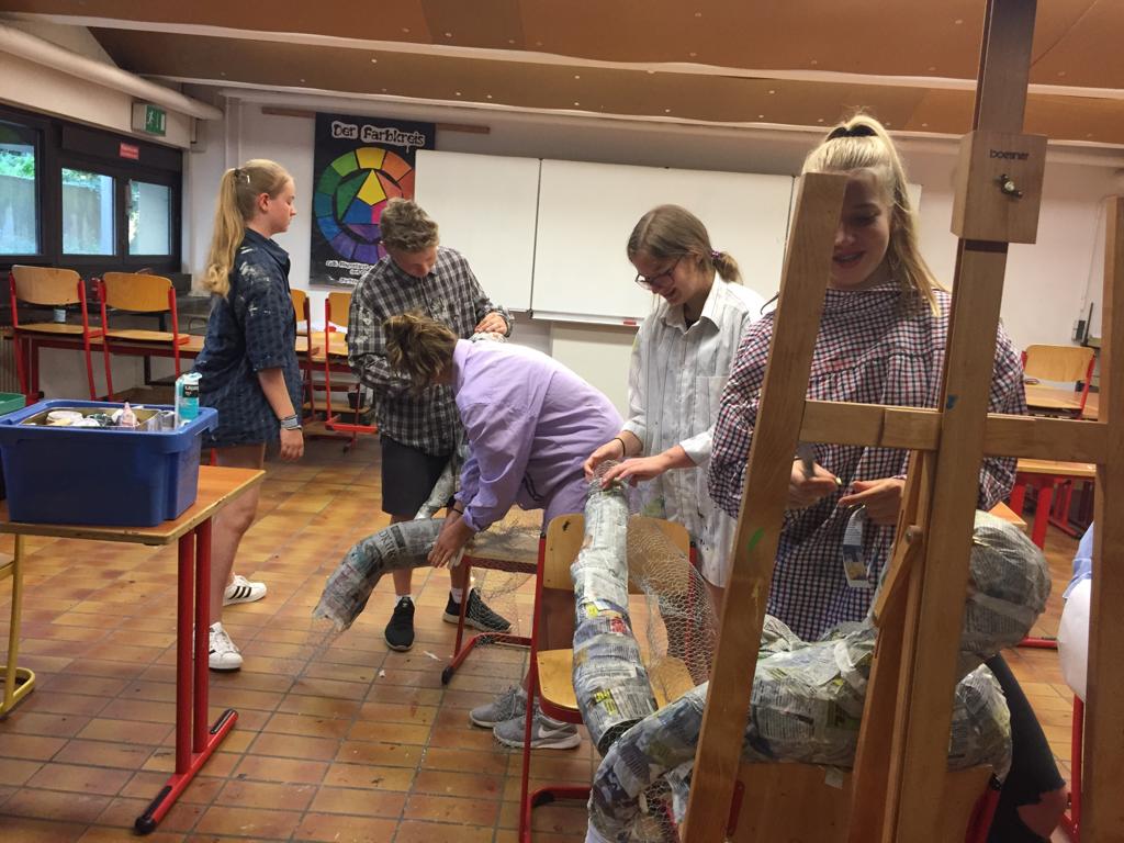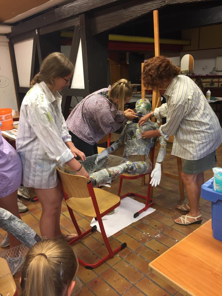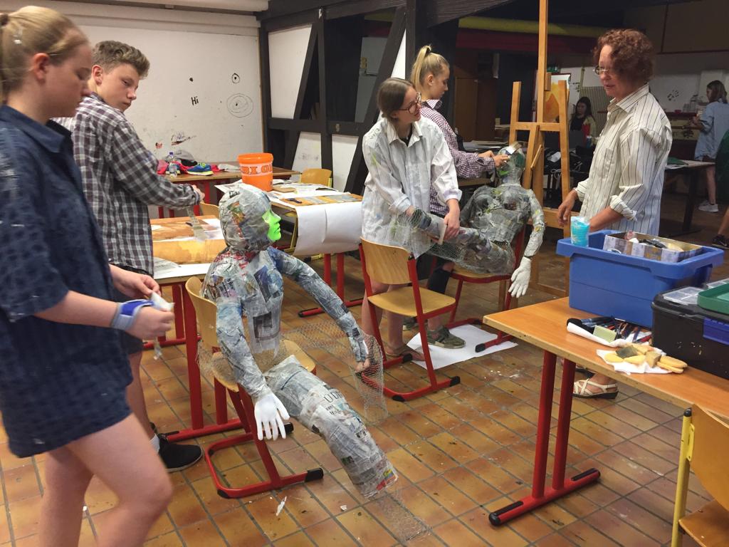 Regina Erb-Schalk wurde im Sommer 2019 in den wohl verdienten Ruhestand entlassen. In den letzten Schultagen hatte sie mit Schülern der 9. Klassen jedoch noch ein allerletztes Mal ein tolles Kunstprojekt durchgeführt. Die Schüler entwarfen aus Gitterdraht, Papier, Kleister, Gipsbinden und Farbe zwei lebensgroße Figuren, die sie Gundula und Anton tauften. Sie sitzen nun vor dem frisch renovierten Schüleraufenthaltsraum.