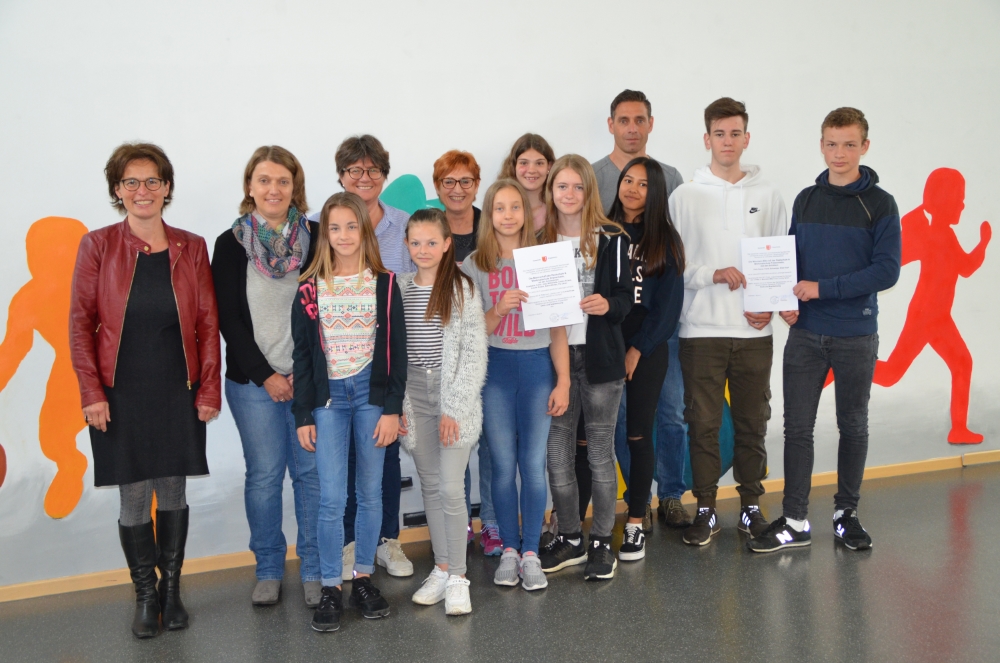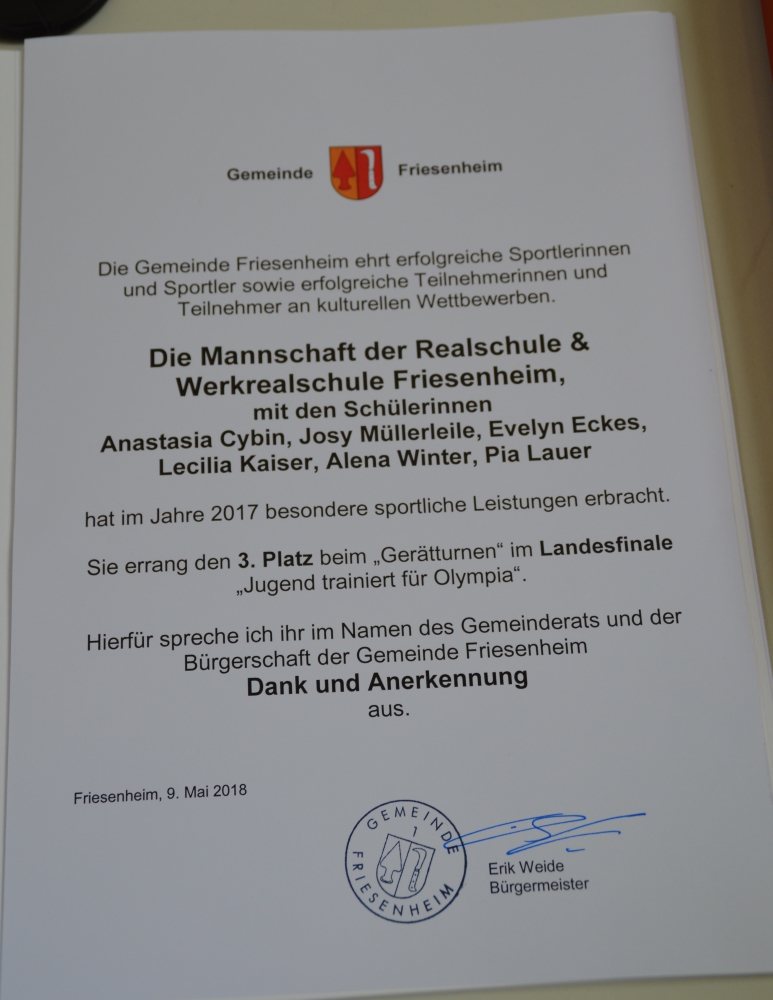 „Dass Schüler immer wieder erfolgreich an Jugend trainiert für Olympia teilnehmen ist fast schon eine feste Größe bei der Sportlerehrung. Diesmal konnte Bürgermeister Weide zudem drei Schüler der Real- und Werkrealschule Friesenheim ehren, die bei der Mountain-Bike Cross Country den ersten Platz beim Finale des Regierungsbezirks Freiburg belegen konnten.“